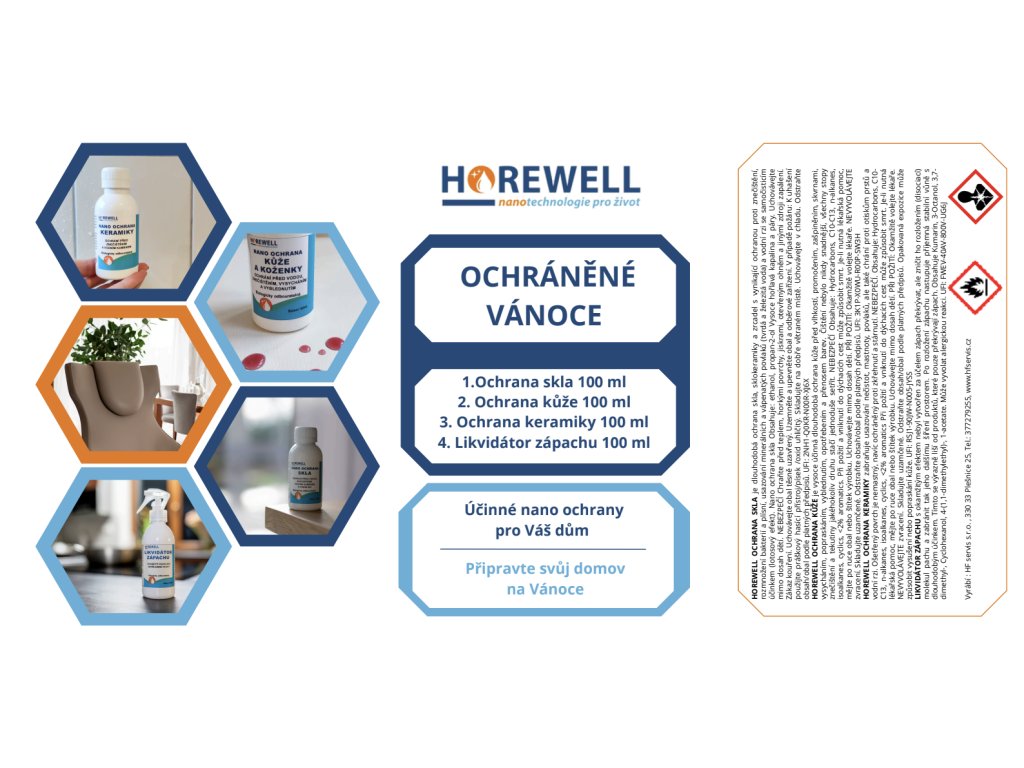 Zahrnuje excelentní Nano ochrany skla a keramiky, které chrání povrchy před znečištěním, mastnotou, vodním kamenem a vodní rzí a Nano ochranu kůže a koženky, která chrání před vlhkostí, promočením, nečistotami, vysycháním, popraskáním a vyblednutím. A samozřejmě nemůže chybět náš nejprodávanější produkt Likvidátor zápachu, který excelentně zničí veškerý zápach a zabrání jeho dalšímu šíření v prostoru.