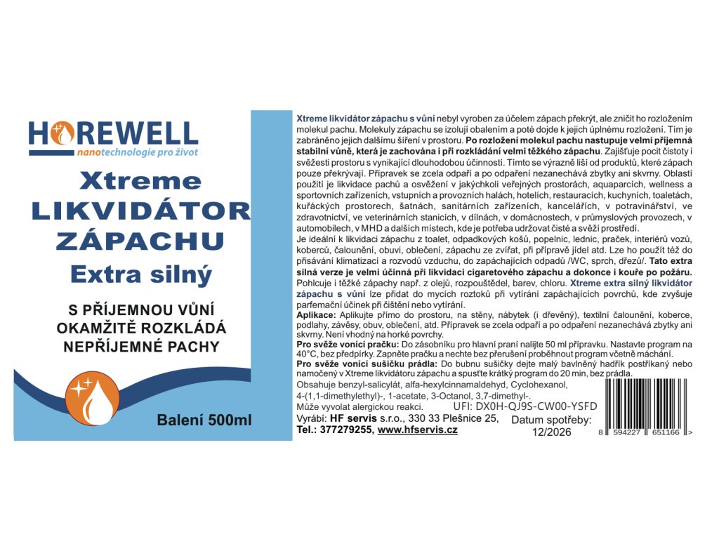 Na jakém principu Horewell likvidátor zápachu funguje? Horewell Xtreme - extra silný likvidátor zápachu s vůní nebyl vytvořen za účelem zápach překrývat, ale zničit ho rozložením (disociací) molekul pachu a zabránit tak jeho dalšímu šíření prostorem. Po rozložení zápachu nastupuje velmi příjemná stabilní vůně s dlouhodobým účinkem. Tímto se výrazně liší od produktů, které zápach pouze překrývají.