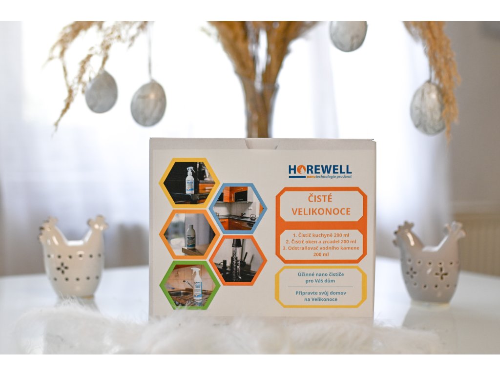 Zahrnuje excelentní Odstraňovač vodního kamene, který snadno odstraňuje silné usazeniny vodního kamene, kyselé mastnoty a vodní rez, dále účinný Čistič kuchyně a Ochranný čistič oken a zrcadel, který dokonale vyčistí skleněné povrchy. Společně zajišťují perfektní čistotu, efektivně a bez námahy.Horewell Nano čistič kuchyně je neabrazivní silný a rychlý čistič znečištěných ploch, velmi šetrný k povrchu. Ošetřený povrch je po opláchnutí pitnou vodou nezávadný pro potraviny, což dokládá potravinářský atest.